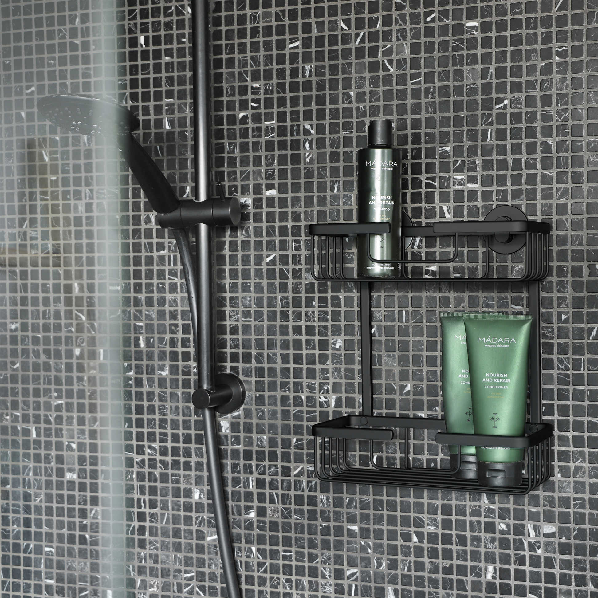 Deze stijlvolle flessen- en zeephouder in de kleur mat zwart is een prachtige toevoeging voor uw doucheruimte ruimte. Deze draadmand met twee lagen wordt geleverd met krachtige 3M montagestickers voor bevestiging zonder boren of schroeven. De afmetingen van de draadmand is 25cm breed, 30cm hoog en 12 cm diep.