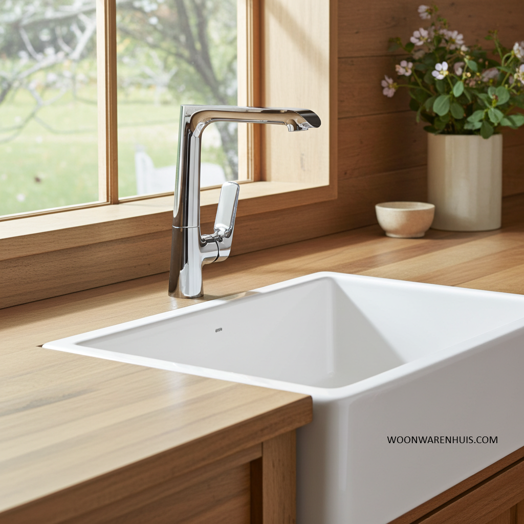 De kraan is vervaardigd van hoogwaardig verchroomd messing, voorzien van keramische schijven en wordt geleverd met Kiwa goedgekeurde aansluitslangen.