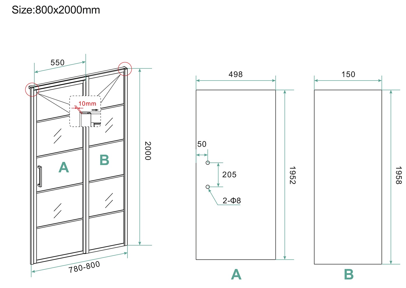 Deze nisdeur heeft een vaste wand van 25 cm en een draaideur van 55 cm. Zie de lijntekening voor de exacte maten van de vaste wand en deur. De opstelling is omkeerbaar dus zowel links als rechts te plaatsen. Een stabilisatiestang wordt bijgeleverd.