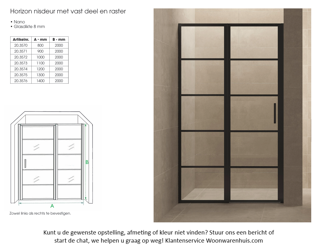 Deze nisdeur heeft een vaste wand van 30 cm en een draaideur van 60 cm. Zie de lijntekening voor de exacte maten van de vaste wand en deur. De opstelling is omkeerbaar dus zowel links als rechts te plaatsen. Een stabilisatiestang wordt bijgeleverd.