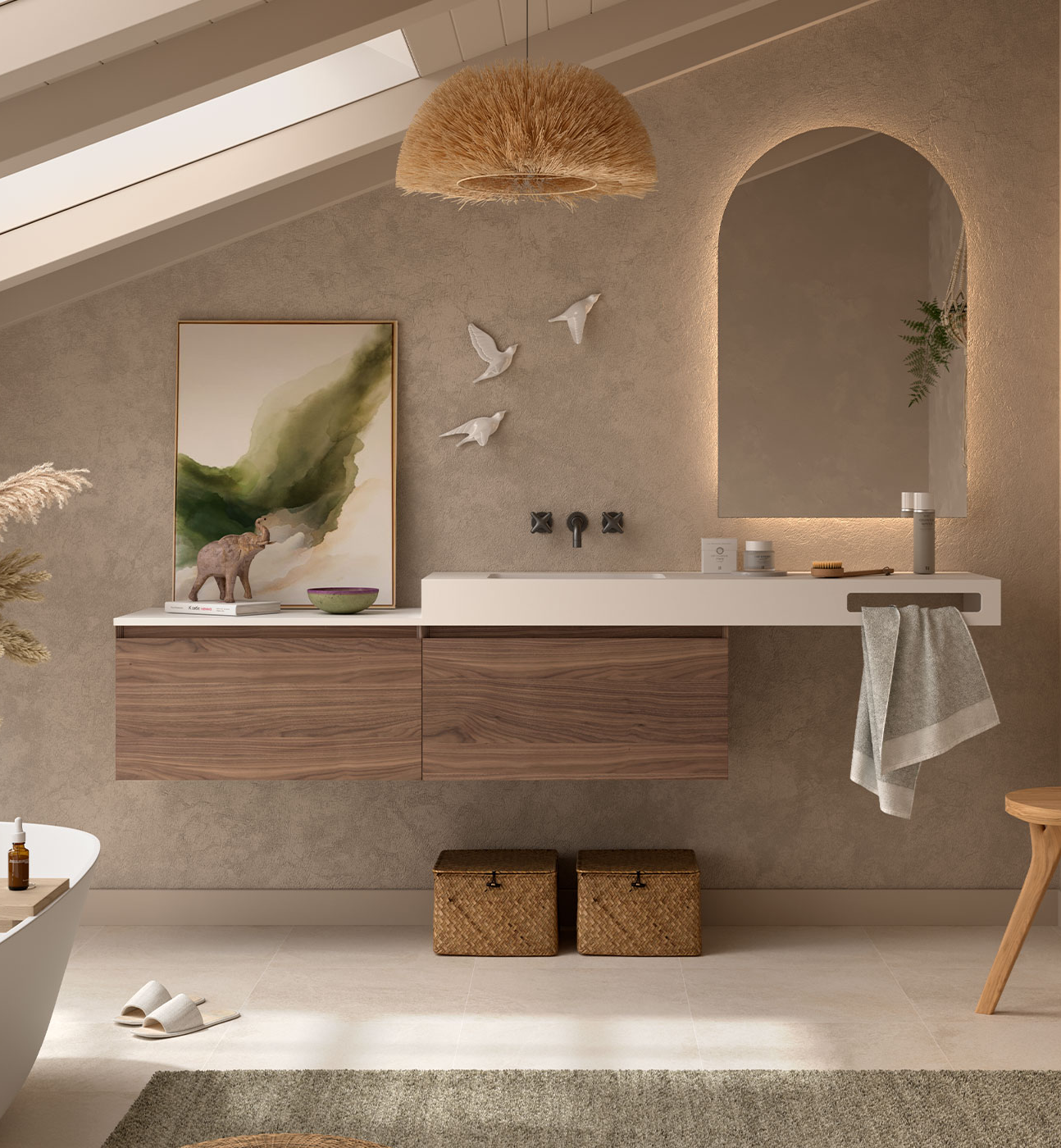 Voor een klant in Noordwijk (ZH) mochten wij meedenken bij een oplossing voor een badkamermeubel onder een schuine kap. De breedte was niet het probleem, de hoogte des te meer. De gehele badruimte had een waanzinnig ruimtelijk gevoel door het vele licht wat binnenviel door de dakramen. Dit gevoel hebben we proberen te behouden door bij de opstelling te kiezen voor een asymmetrische oplossing die in stijl aansloot bij de rest van de badkamer en toch voldoende functionele opbergruimte bood.