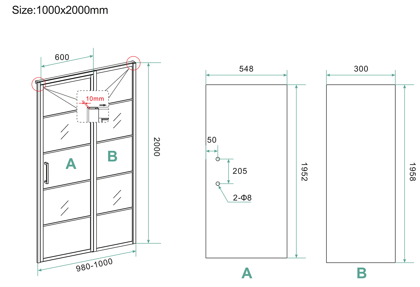 Deze cabine heeft een 100cm vaste wand en een 100cm wand met draaideur. De deur is omkeerbaar dus zowel links als rechts te plaatsen. Een koppelprofiel wordt meegeleverd.