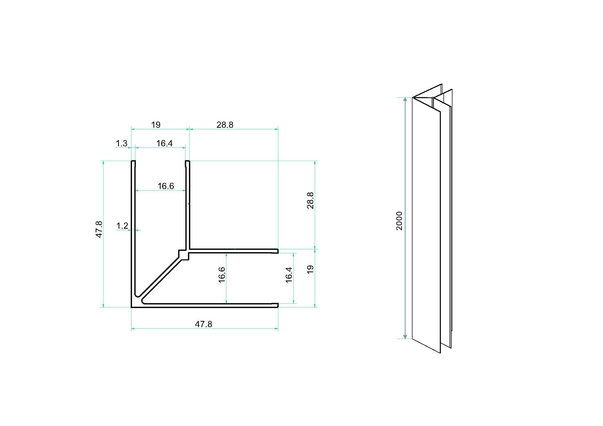 Deze cabine heeft een 120cm vaste wand en een 120cm wand met draaideur. De deur is omkeerbaar dus zowel links als rechts te plaatsen. Een koppelprofiel wordt meegeleverd.