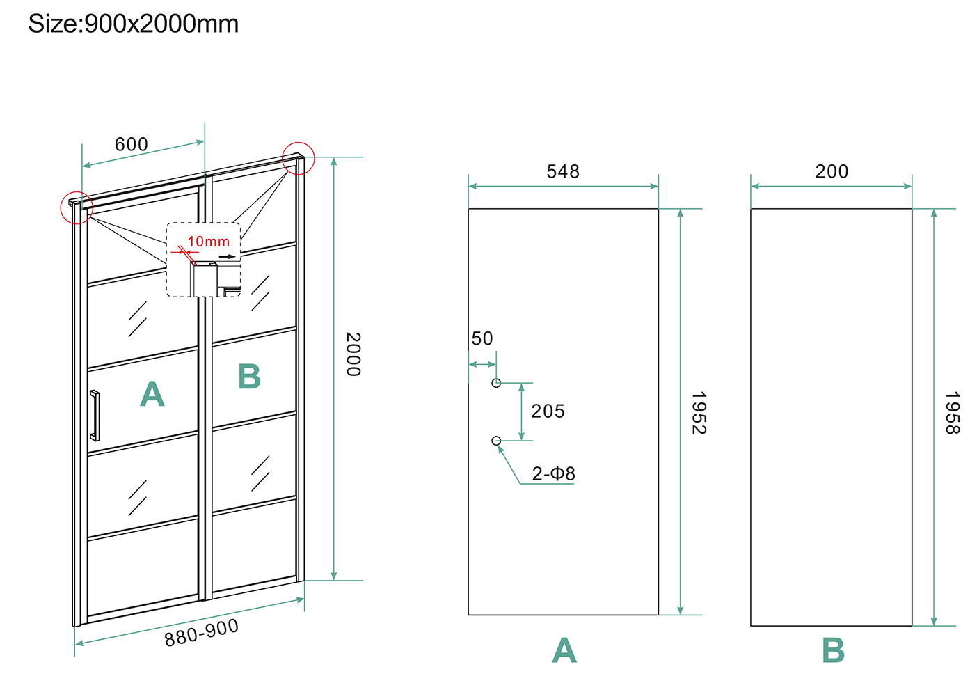 Deze cabine heeft een 90cm vaste wand en een 90cm wand met draaideur. De deur is omkeerbaar dus zowel links als rechts te plaatsen. Een koppelprofiel wordt meegeleverd.