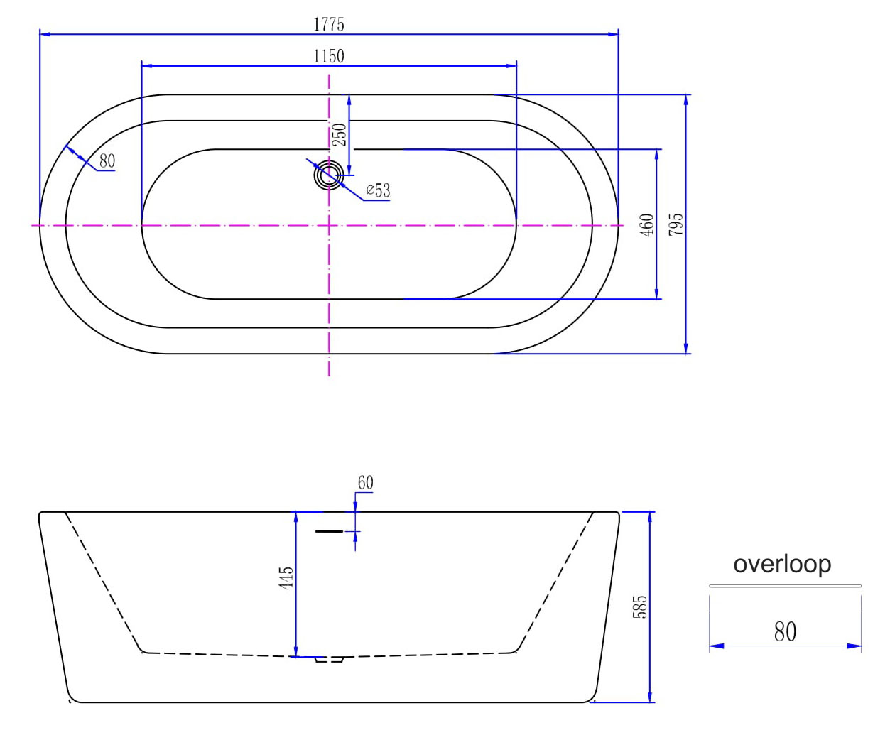 De bodemafvoer zit recht onder de centraal geplaatste overloop, waardoor het maximale gebruiksgemak is gecreëerd. De afvoerplug (waste) in glans wit wordt meegeleverd De rugzijde is zo ontworpen dat een relaxte houding ontstaat in gebruik. De overloop is geïntegreerd in de voorzijde (de niet-muur zijde) van het bad.